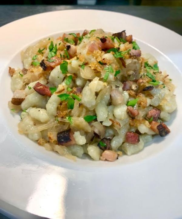 Bramborové halušky se zelím a uzeným masem