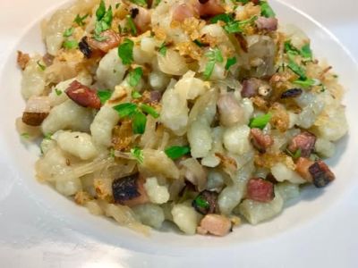 Bramborové noky s hříbkovou omáčkou, sušenou vepřovou panenkou a baby špenátem, sýr Gran Moravia 137