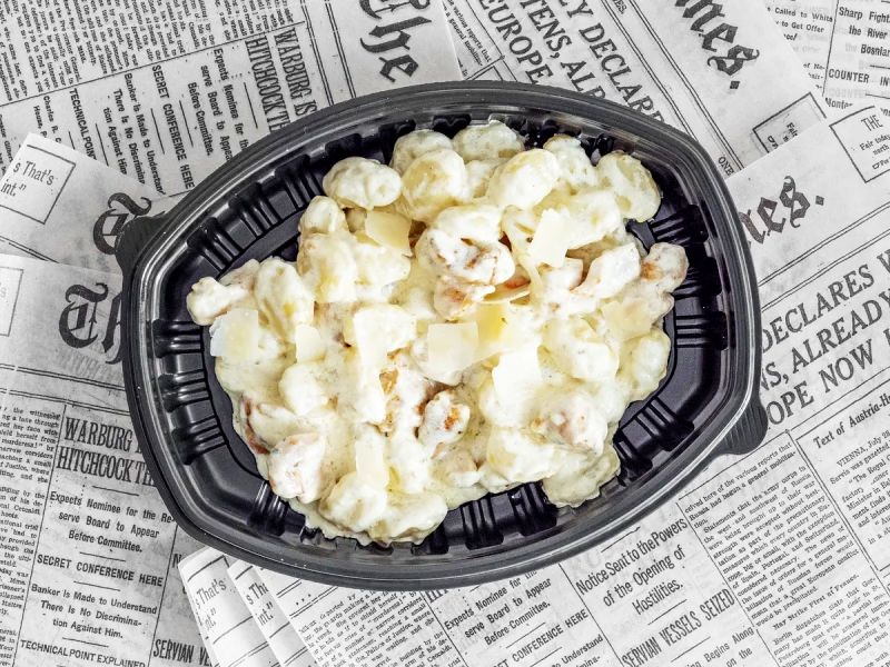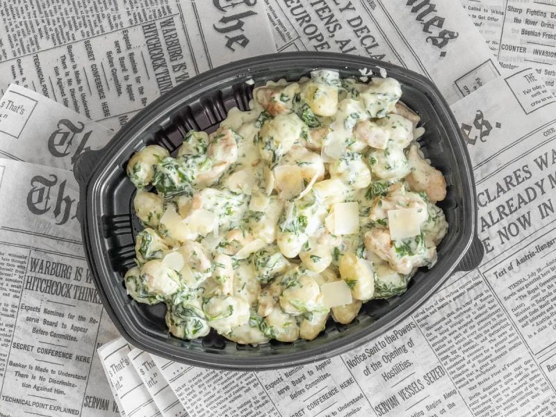350g Domácí noky s kuřecím masem, listovým špenátem a smetanou