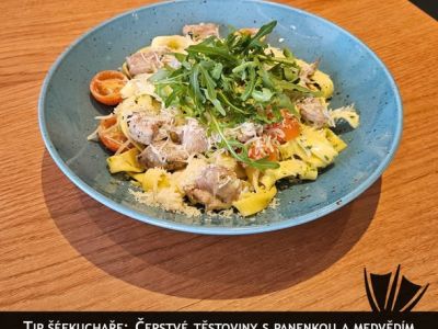 200g Tagliatelle s kousky lososa, brokolice, šalotka a smetana