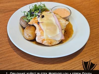 3. SMAŽENÝ PASTÝŘSKÝ SÝR Gouda plněný plátkem šunky v trojobalu, vařený brambor s máslem, pažitka, tatarská omáčka 137910
