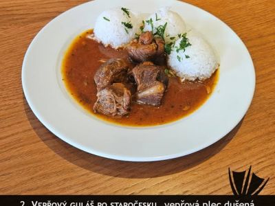 hovězí guláš, bramboráčky, křen, cibulka (1,3)