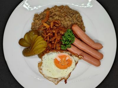 150 g Čočka na kyselo s grilovanou klobásou, volským okem a kyselou okurkou, chléb 137