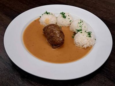 Rozstřelený hovězí ptáček podávaný s rýží 165, -