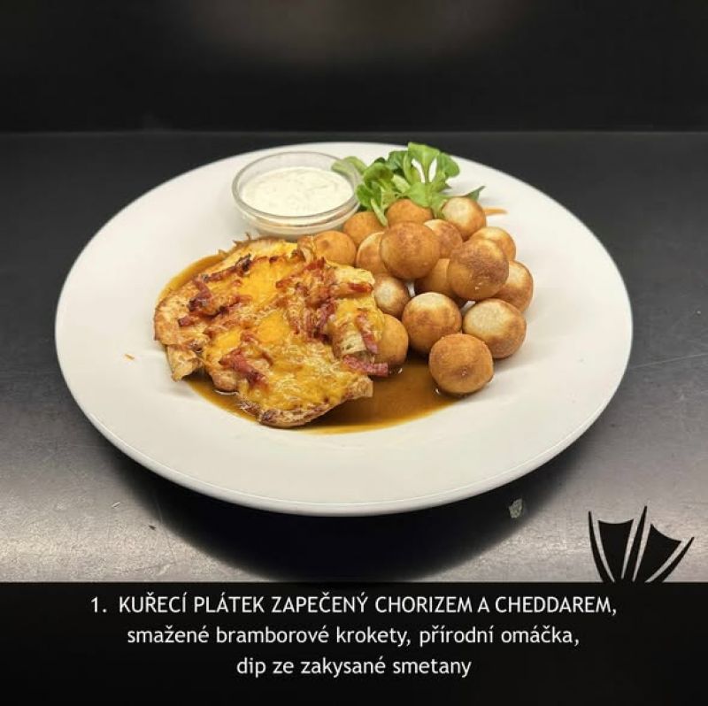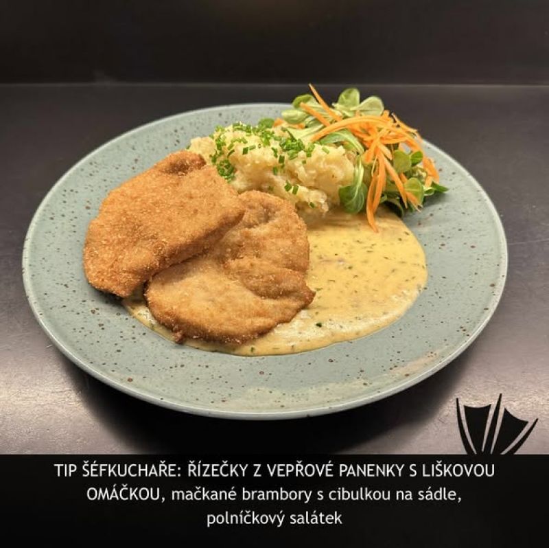 smetanovou omáčkou a hranolky