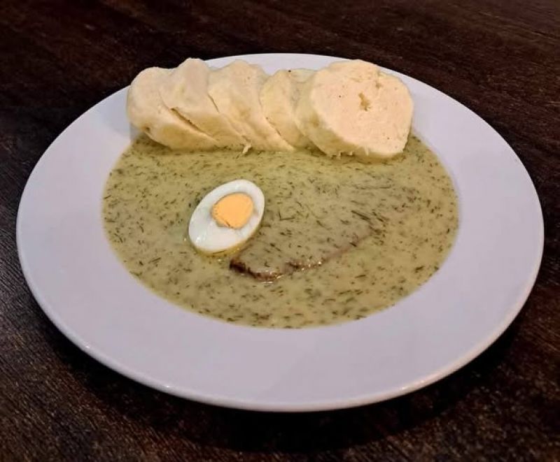150g Čočka na kyselo s grilovanou klobásou, kyselá okurka, vejce a čerstvý chléb 1310