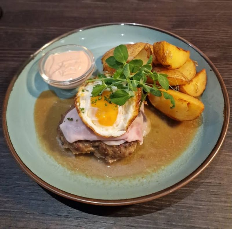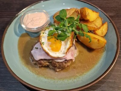 160g Vepřový plátek, sázené vejce, hranolky, vařený brambor
