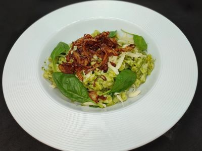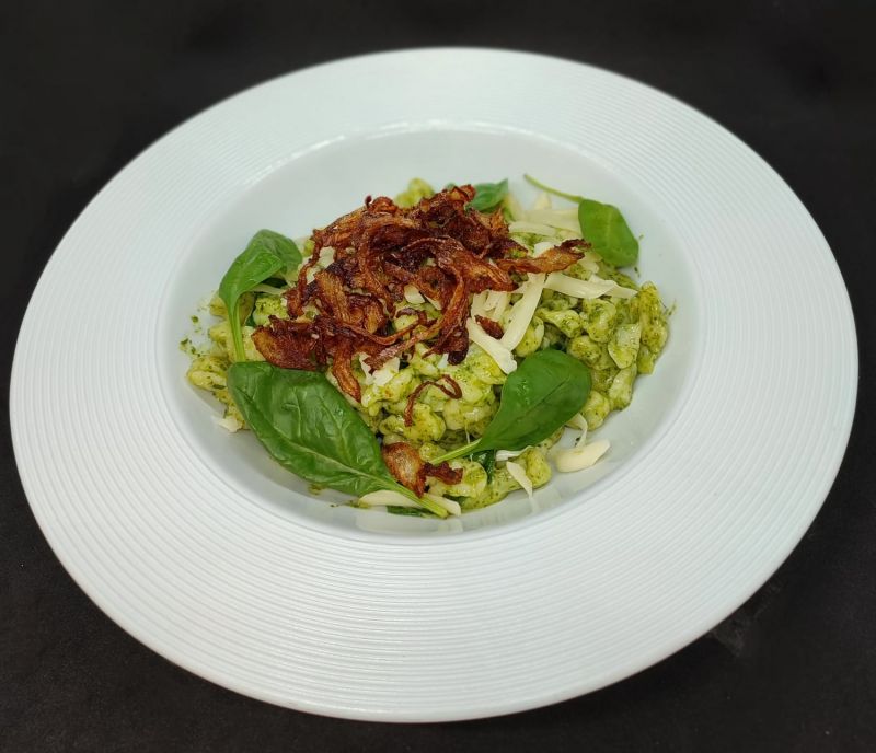 Pomalu dušený kančí guláš v silném cibulovém základu servírovaný s restovanými špeclemi zdobený