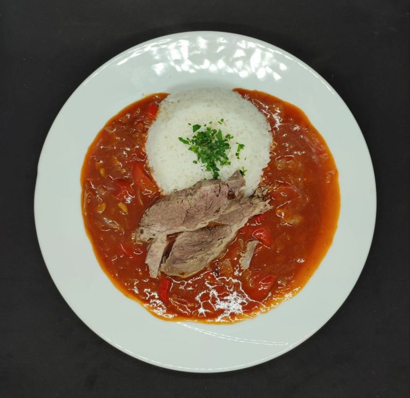 130 g Vepřový guláš s cibulkou a křenem, housk. Kn
