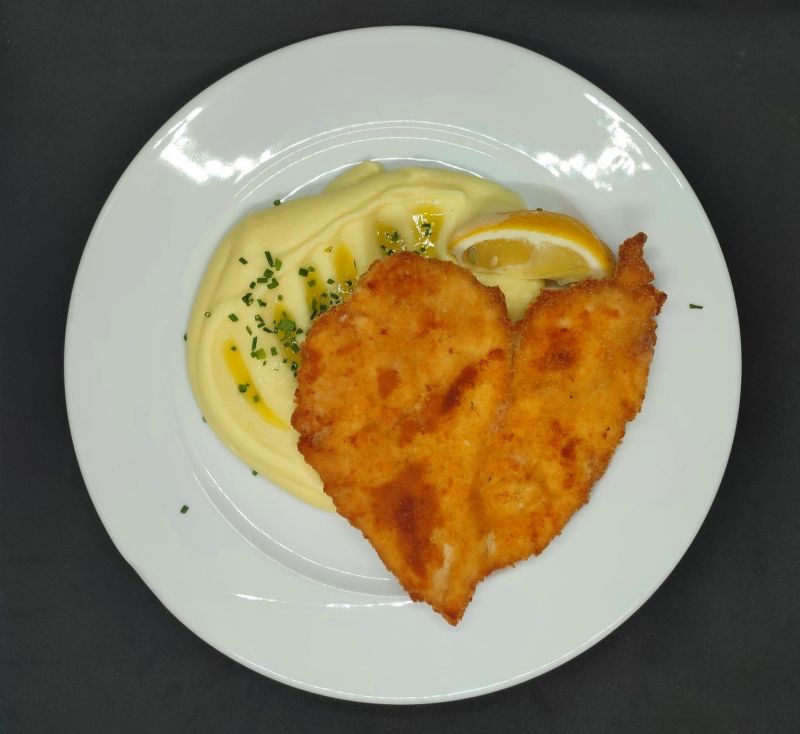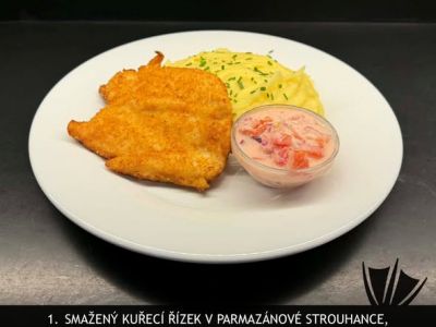 Sekané vepřové řízečky s Ementálem, domácí bramborová kaše, minisalátek