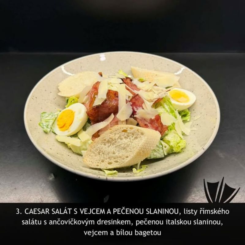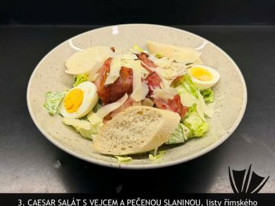 CAESAR SALÁT grilovaná kuřecí prsíčka na římském salátu s dipem z olivového oleje a žloutky s citronovou šťávou, krutony a parmazánem