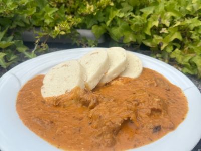 Segedinský guláš "speciál" zjemněný smetanou, houskový knedlík