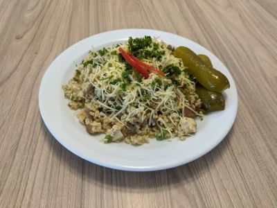 Rizoto s kousky masa z vepřové kýty, kořenová zelenina, zelený hrášek a kukuřice, sypané strouhaným sýrem, kyselá okurka