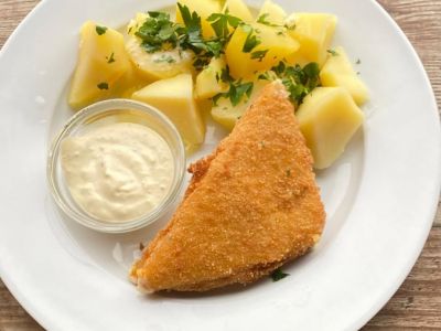 Smažený sýr Gouda 48% plněný šunkou, domácí tatarská omáčka, vařené pažitkové brambory