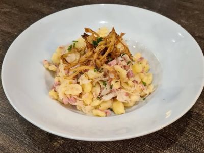 200g Halušky namíchané s restovaným domácím uzeným, bílé kyselé zelí, osmažená cibulka na sádle