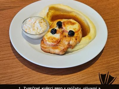 150g Domácí pečená sekaná se zeleninou a sýrem s bramborovou kaší a kyselou okurkou