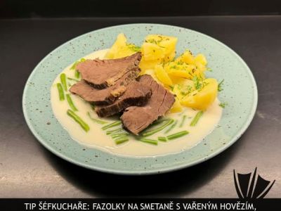100g/1ks Hovězí maso a vejce s koprovou omáčkou, houskovým knedlíkem nebo vařeným bramborem