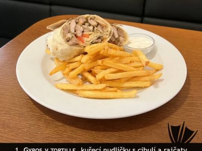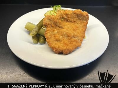 1. 150 g Vepřová kotleta v bramboráku, zeleninový salát (A:1,3,7)