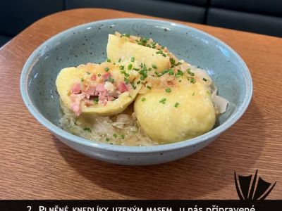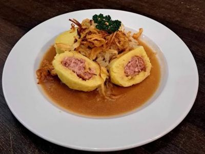 300g Plněné bramborové knedlíky uzeným masem, zelí, cibulka