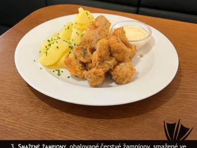 3. 150 g Smažené marinované vepř. řízečky, lehký brambor. salát s jarní cibulkou a ředkvičkou (A:1,3,7)