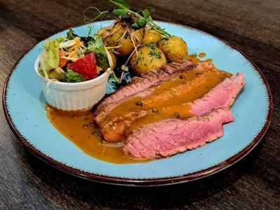 180g Steak z vepřové krkovice s opečeným bramborem na cibulce a česneku s pepřovou omáčkou 175,