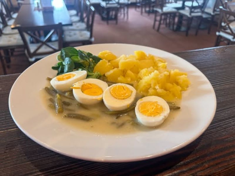 Fazolky na kyselo s vařeným vejcem, vařený brambor