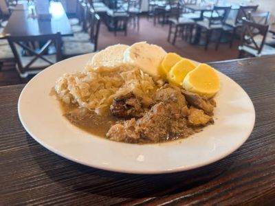 Vepřové výpečky, bílé zelí, variace knedlíků (houskový, bramborový) 145 Kč