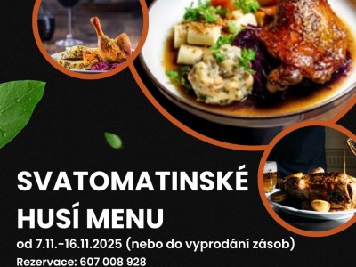 Husí stehno, cibulové červené zelí, bílé zelí, žemlový knedlík s perníkem, bramborový dortík, lokš, škvarky, smažená cibulka