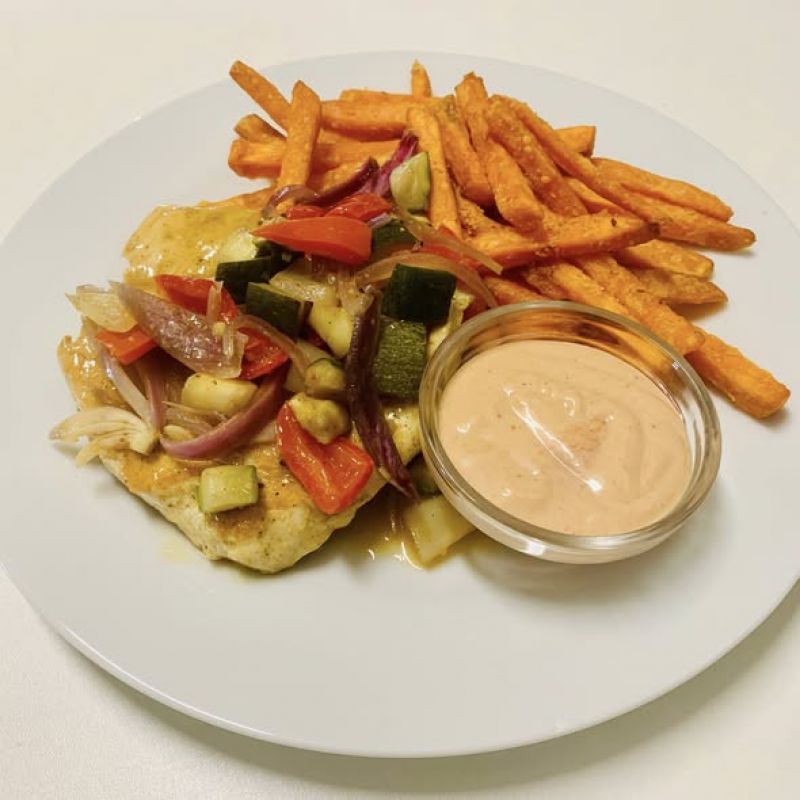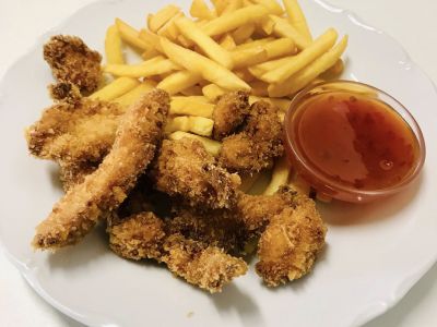140 g Kuřecí steak se šunkou a broskví, gratinovaný sýrem, hranolky
