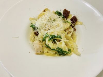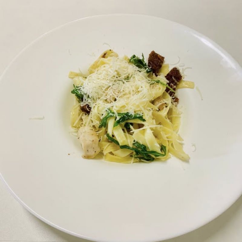 120g Kuřecí nudličky se sušenými rajčaty, smetanová omáčka, těstoviny, parmazán