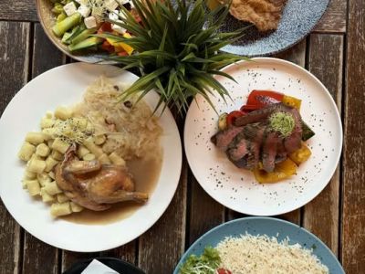 240g Pečené kuře na másle, bramborová kaše, okurkový salát
