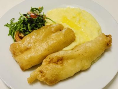 150g Smažená kuřecí kapsa plněná slaninou a goudou, bramborová kaše