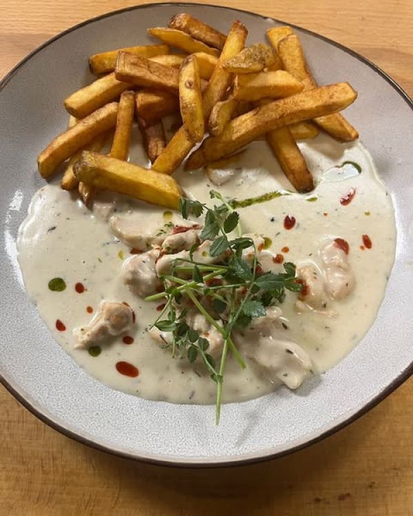 Bramborové noky s kuřecím masem ve sýrové omáčce
