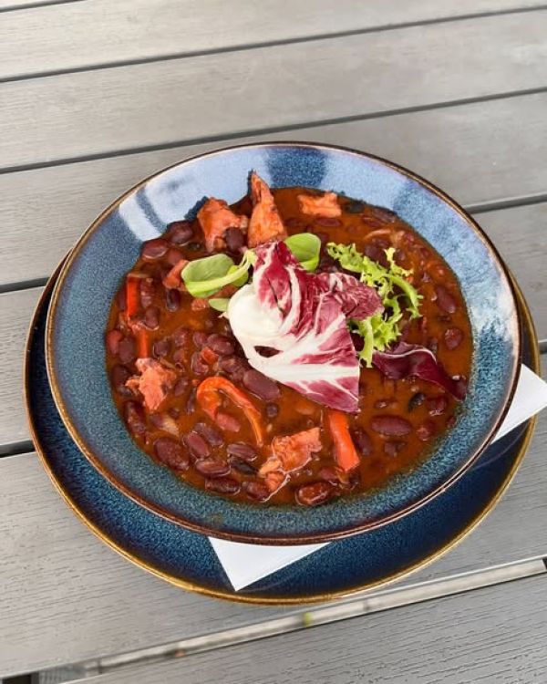 Fazole „Chilli con carne“ zakápnuté zakysanou smetanou, chléb