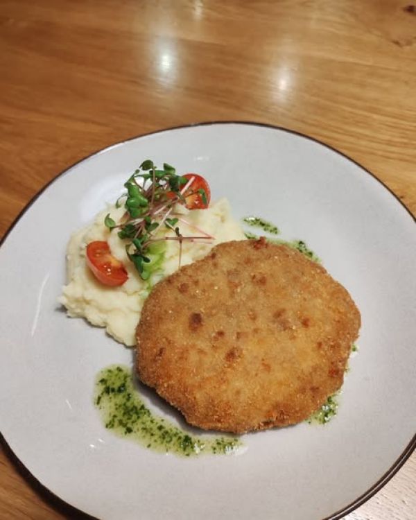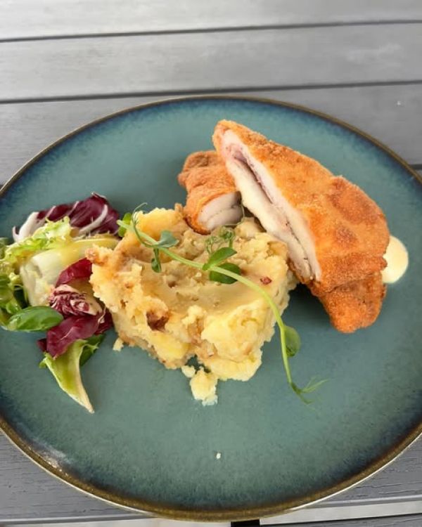 Smažená kuřecí kapsa plněná šunkou a hermelínem, bramborová kaše, salátek