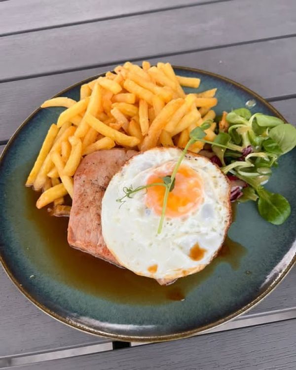 Náš hovězí HAMBURGER z irského podplečí s anglickou slaninou, čedarem, karamelizovanou cibulkou a saláty, třený aioli, hrstka hranolek