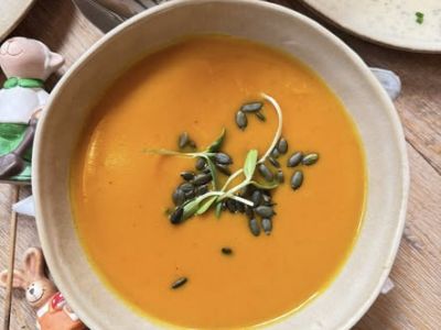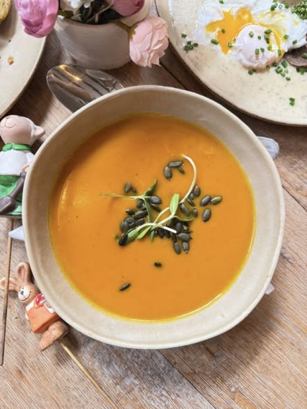 #1Hráškový krém s mátou brambory, krutóny, pancetta, hráškové výhonky