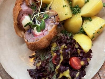 150g Králičí hřbetní řízek, bramborová kaše, kyselý okurek