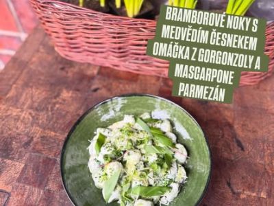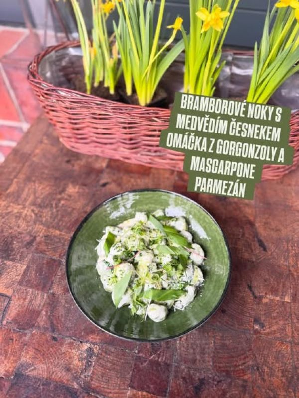 Kuřecí supréme s krémovou omáčkou z medvědího česneku, grenaille brambory s restovanými žampióny a cherry rajčaty