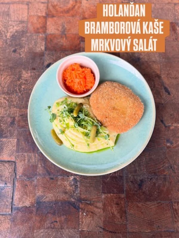 120g Smažený hermelín, americké brambory, hořčičná omáčka, salát /A1, 3, 7, 10/