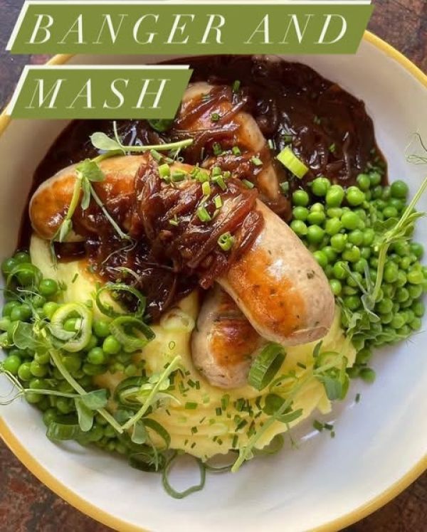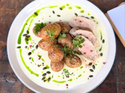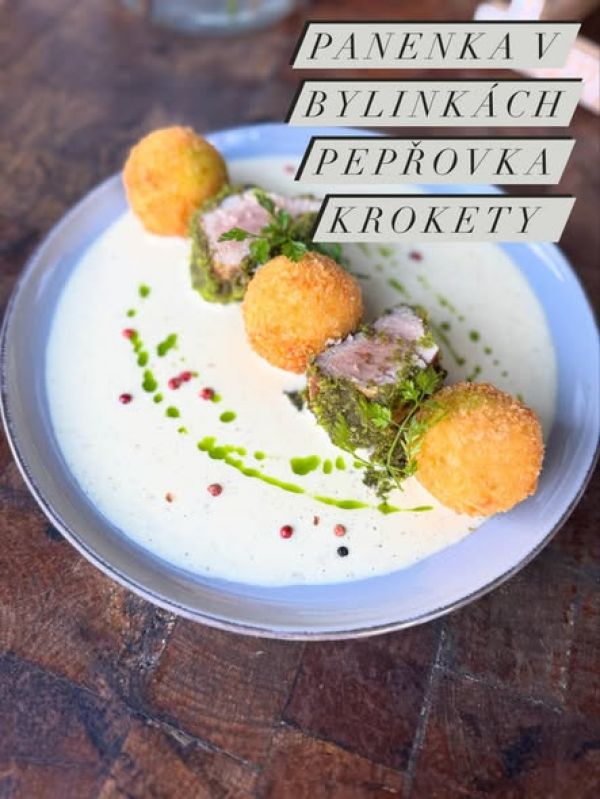 Grilovaná vepřová játra, šťouchaný brambor, karmelizovaná cibule, slanina, demi glace, tatarka