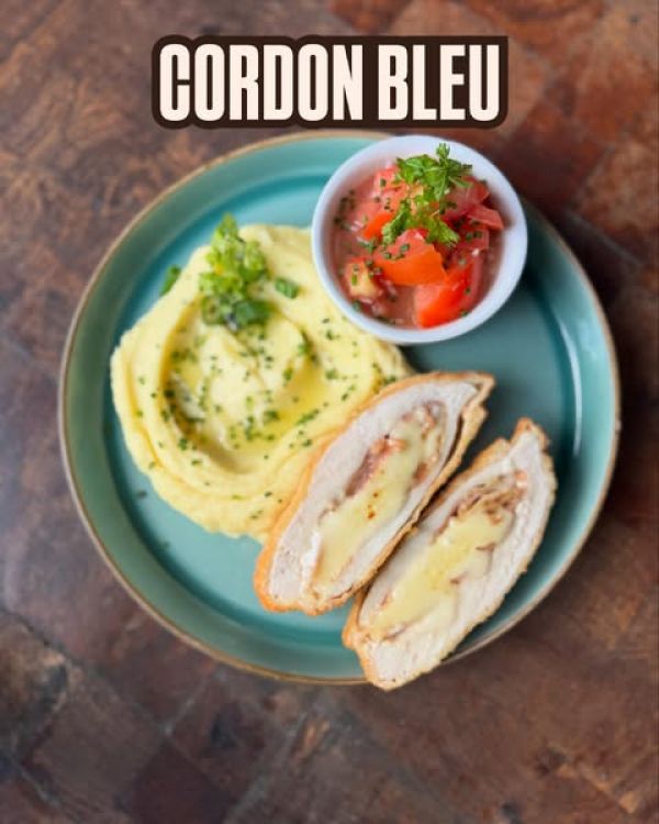 Bezlepek:100g Smažená kuřecí kapsa plněná, bramborová kaše