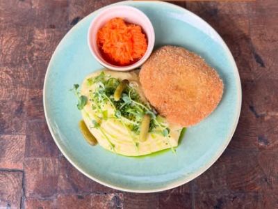 150g Smažený kuřecí řízek obalený v kukuřičné strouhance s máslovou bramborovou kaší a coleslaw salát