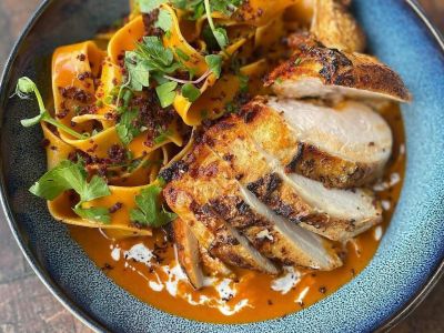 150g Grilované kuřecí kousky s omáčkou z modrého sýru s pórkem a špeclemi