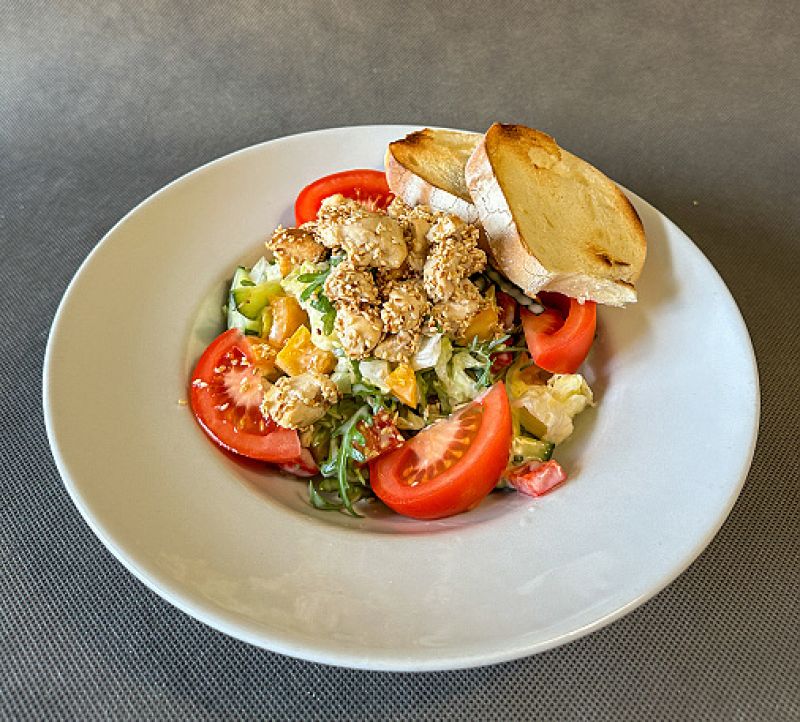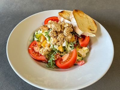 150g Smažený kuřecí řízek zdobený citrónem, bramborový salát s majonézou