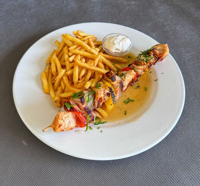 150g Kuřecí špíz, opékané brambory, dresink A 7