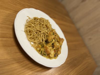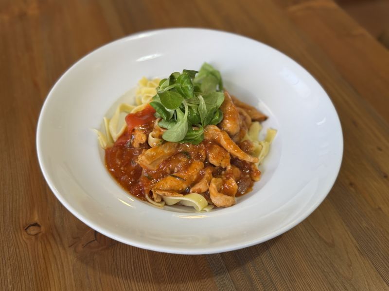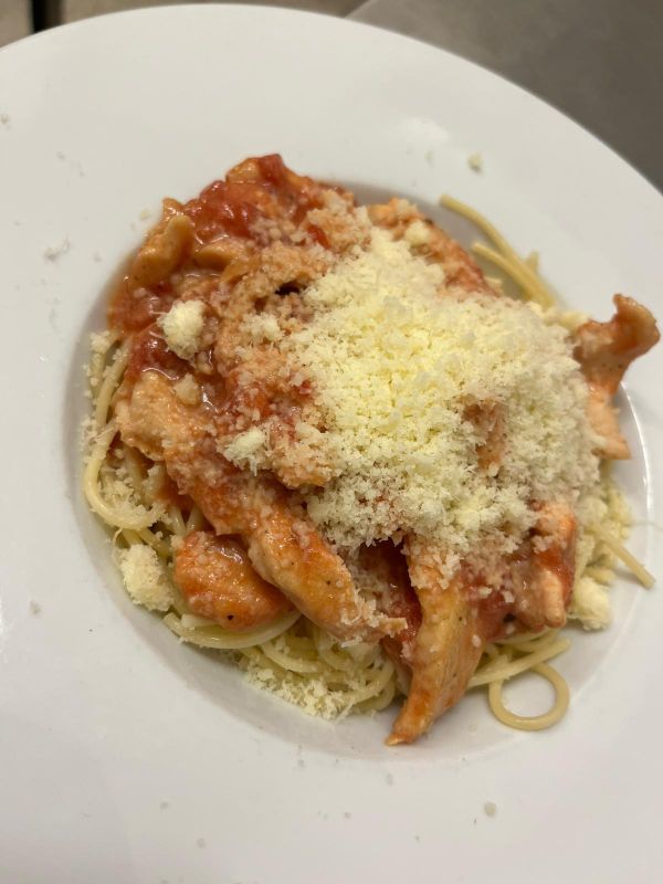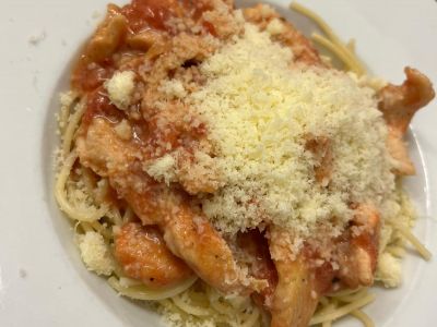 Špagety s kuřecím masem, drcenými rajčaty, smetanou a bazalkou, sypané parmezánem 137