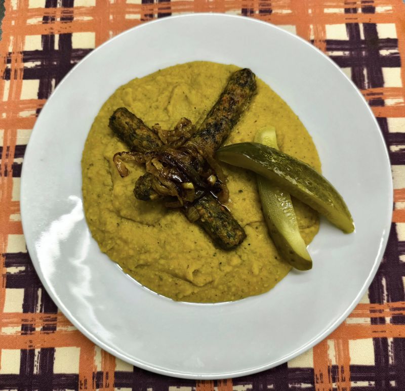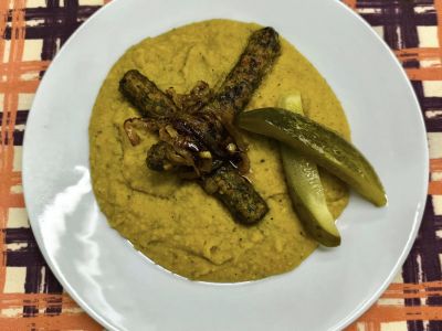 Vařené uzené vepřové maso s hrachovou kaší, cibulkou, okurkou a chlebem 17