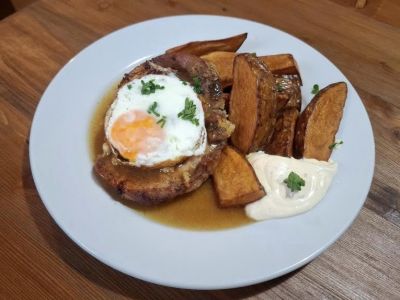 150g krůtí plátek s vejcem a slaninou, hranolky, dip A 1, 3, 7