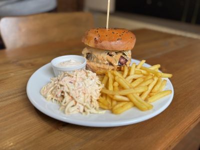 200g Kuřecí steak se šunkou, cibulovým čatní a volským okem, hranolky